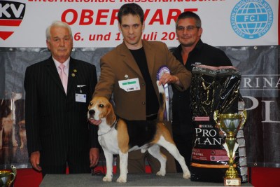 Ich war auf der Internationalen Hundeausstellung in Oberwart am 16. Juli 2011 (darum konnte ich am WE auch nix nähen – haha). Der von mir gezüchtete Rüde Glossy Gamble von der Thurnmühle wurde Best of Day (also bester Hund der ganzen Ausstellung von allen Rassen) – eine unglaubliche Auszeichnung. Und das Beste: er hat 2008 bereits einmal diesen Titel geholt und ist damit der einzige österreichische Beagle, der diese Auszeichnung zwei Mal für sich entscheiden konnte. Bin natürlich megastolz – eh klar ;-!