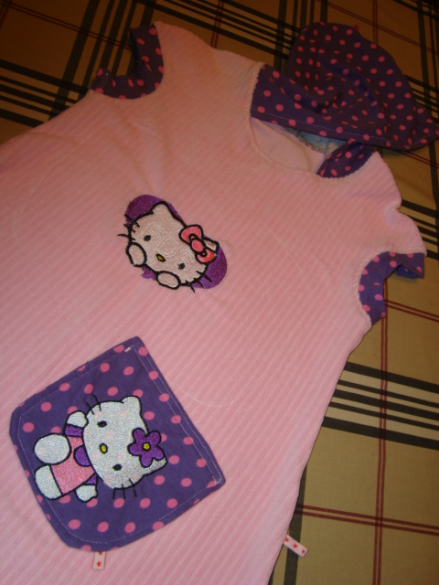 Maus ist zu Ihrer 1. Geburtstagsfeier von einer Kindergartenfreundin eingeladen, boah – spannend. Wir haben uns neben 2 Playmobil Maxerln geeinigt, dass wir ein „Rockerl“ machen (was natürlich ein Kleiderl ist – nicht aber bei Maus – da ist das ein Rockerl). Es wurde eine Amelie, die ist schnell genäht, mit Hello Kitty bestickt – das geht immer in dem Alter. Hoffen wir, dass es auch gefällt und passt.