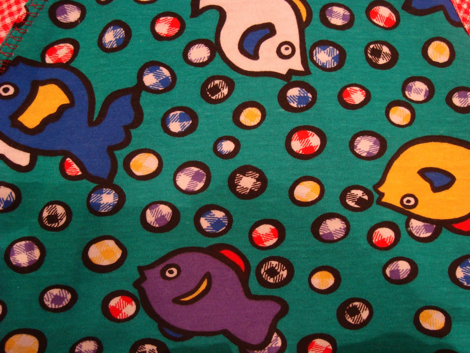 Ihr erinnert Euch noch an das unplanmässige Stickbild von Arielle? Nun – das ist nun daraus geworden, aber nicht ganz so geplant … Ich hatte ja noch diesen netten Retro-Jersey, den ich vor ca. 20 Jahren gekauft hatte (ich habe bis heute keine Ahnung, warum). Die Fischeln haben ja förmlich um die Arielle gebettelt, oder? Den wollte ich dafür verwenden. Nur, was draus machen?