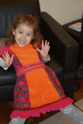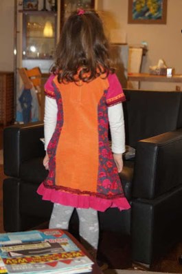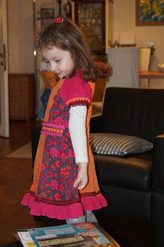 Der Schnitt erscheint mir sehr wandelbar. Ich bin total stolz auf meine ersten gelungenen Rüschen als Abschluß. Das Kleiderl hat sehr viele nette Details, die man am Foto so garnicht erkennen kann. Ich bin sehr zufrieden, Kindi halbwegs, sie mokiert sich ein wenig, dass es sich nicht so schön dreht, wie Henrika … Beim Verschluß scheine ich etwas falsch interpretiert zu haben, es blieb mir dann nur noch der nahtverdeckte Reißverschluss – ich hatte keinen in einer passenden Farbe, aber zum Glück von aussen sieht man ihn nicht und so kritisch ist die kleine Madame ja dann NOCH nicht.