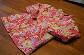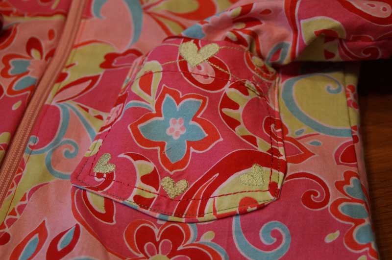 Gestern ist nun diese Übergangsjacke entstanden. Sie ist aus pinkfarbenen Taslan, innen mit diesem wunderschönen frühlingshaften Baumwollstoff. Ich habe einen Wendezipp verwendet, so kann die Jacke beidseitig getragen werden. Die Bündchen wachsen länger mit, die Jacke ist 1 Nummer grösser genäht und passt hoffentlich länger.