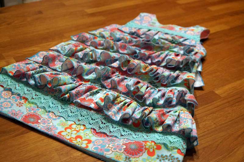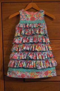 Ich liebe ja die Roos Schnitte und habe sehr viele davon. Aber ich nähe sie selten … nun weiss ich wieder warum :-(! Das Kleid sieht lieb aus und kommt dem Original auch aufgrund der ähnlichen Stoffwahl sehr nahe. ABER – es war ein Fehler im Schnittmuster und am Ende hatte ich 7 Stufenteile, aber nur 5 Rüschen …- ich konnte mit dem übrigen Stoff noch 1 Rüschenstufe zaubern – aber für die letzte Stufe hat es nicht mehr gereicht … sehr ärgerlich. Ich habe das Schnittmuster immer wieder kontrolliert – nein, ich habe mich nicht vertan, es ist tatsächlich FALSCH. Auf dem Bild kann man auch klar erkennen, es sind nur 6 Teile und 6 Rüschen :-(.