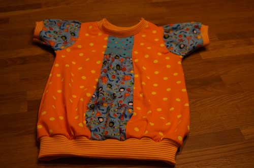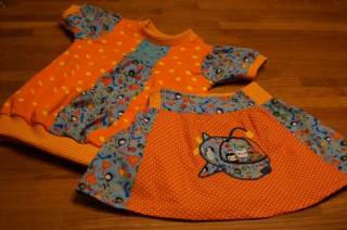 … bestehend aus FM Sommerliebe, bestickt mit einem Oktonauten-Motiv. Der Stoff hat einfach danach verlangt – für meine Oktonauten-bekennende Prinzessin. Kombiniert mit sommerfrischem orange und gelb. Oberteil ist ein Josefinchen auf sportliches T-Shirt getrimmt.