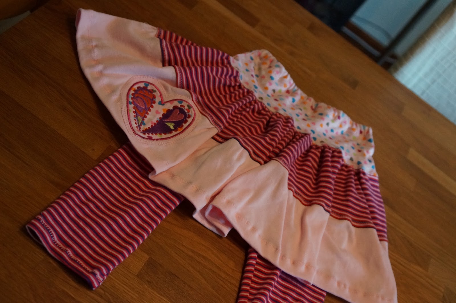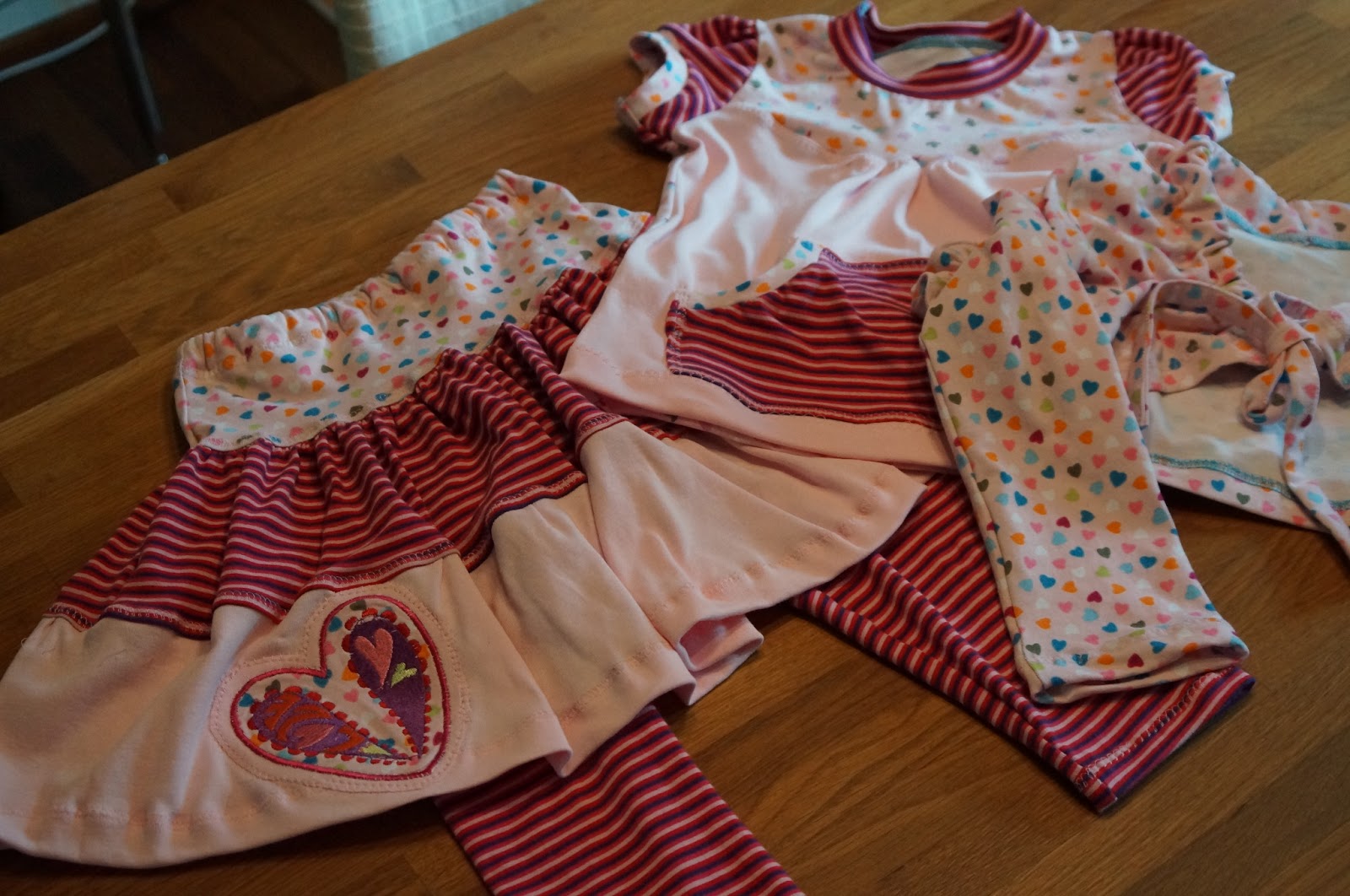 Aber nähen ist für mich wichtig, daher habe ich mir am Wochenende eine Auszeit gegönnt – entstanden sind eine Farbenmix Caroline, eine Farbenmix Shirt Klein Fanö, ein Haargummi, und ein Farbenmix Bolero Kerstin. Alles Grösse 110/116 mit Stoffen von Happy Home. Es ist auch ein Puppenoutfit entstanden nach einem Roos Schnittmuster – das muss ich erst fotografieren.