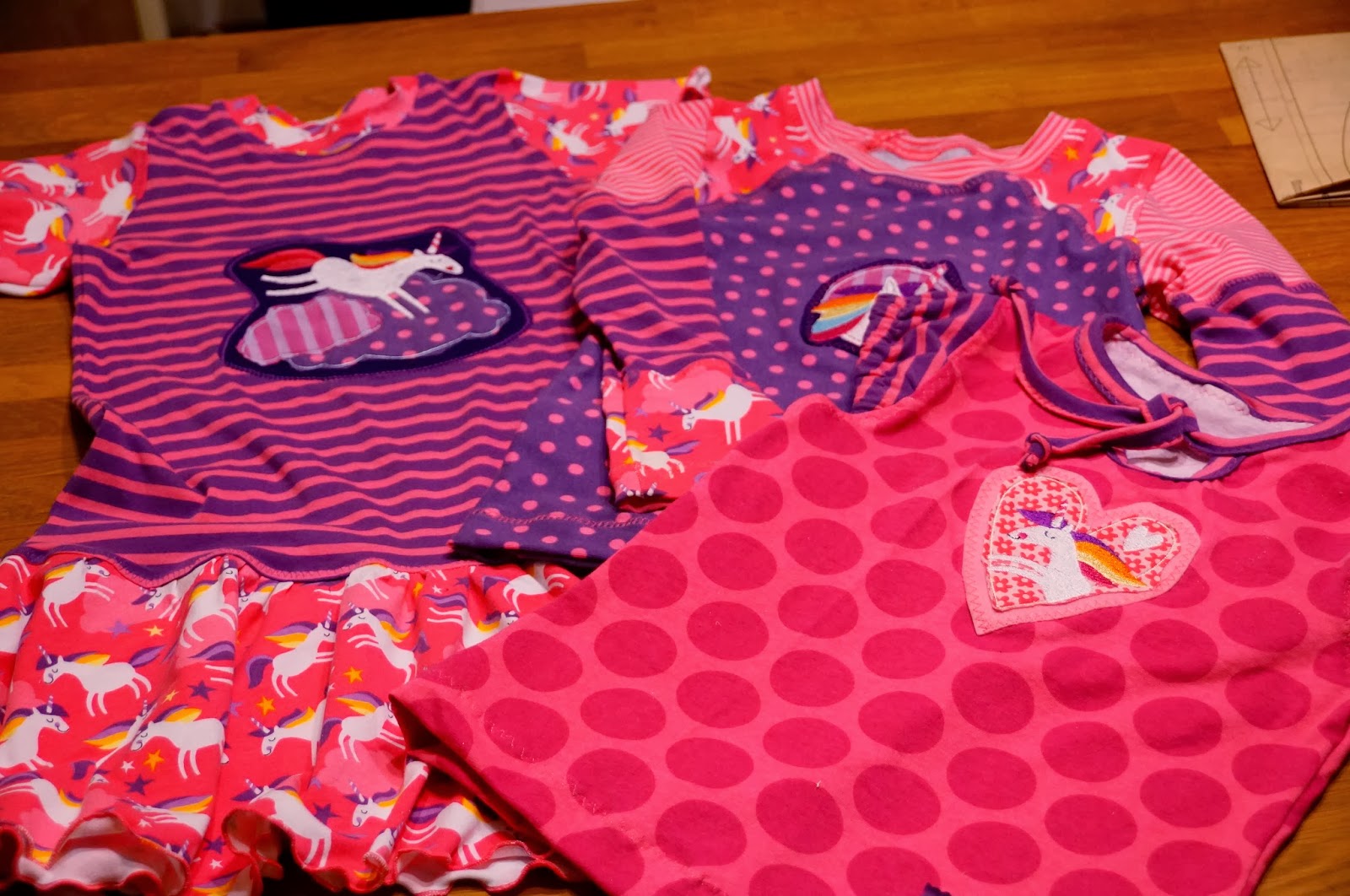 Hier passend zur Geburtstagsserie eine Herbstkombi mit Kurzarm in Grösse 122. Stoffe Michas Stoffecke und Fundus, Stickdatei Lenis Dream.