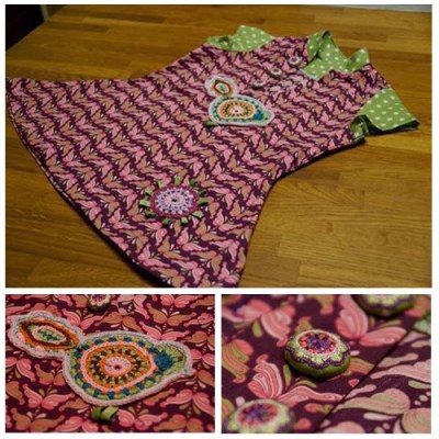 Trotzdem möchte ich Euch meine Dinge nicht vorenthalten, fangen wir also mit der Lillesol Frühlingsbluse an. Stoffe hat sich meine Tochter ganz alleine ausgesucht, ich finde die Farbkombi extrem gelungen. Ein super hübscher Schnitt, der auch angezogen extrem lieb aussieht. Mit 6 Teilen auch extrem schnell genäht. Am längsten hat das Sticken und Beziehen der Knöpfe gedauert, aber die mussten einfach sein! Sie passen einfach perfekt! Ebenfalls Platz gefunden auf der entzückenden Bluse hat ein gehäkeltes Vögelchen.