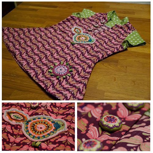 Trotzdem möchte ich Euch meine Dinge nicht vorenthalten, fangen wir also mit der Lillesol Frühlingsbluse an. Stoffe hat sich meine Tochter ganz alleine ausgesucht, ich finde die Farbkombi extrem gelungen. Ein super hübscher Schnitt, der auch angezogen extrem lieb aussieht. Mit 6 Teilen auch extrem schnell genäht. Am längsten hat das Sticken und Beziehen der Knöpfe gedauert, aber die mussten einfach sein! Sie passen einfach perfekt! Ebenfalls Platz gefunden auf der entzückenden Bluse hat ein gehäkeltes Vögelchen.