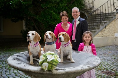 Die Hunde haben übrigens auch ein farblich passendes Outfit verpassst bekommen.