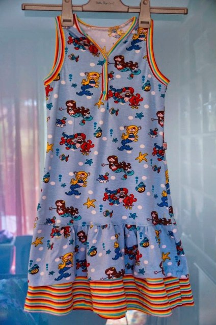 Das Knopfkleid wurde nicht nach dem Original-Schnittmuster gemacht, ich habe es aus Sommerkombi und Knopfshirt selbst zusammengebastelt. Obenrum ist es gut geworden, unten bin ich nicht sicher, wie das Original gemacht wurde. Aber es gefällt, weil es dreht!