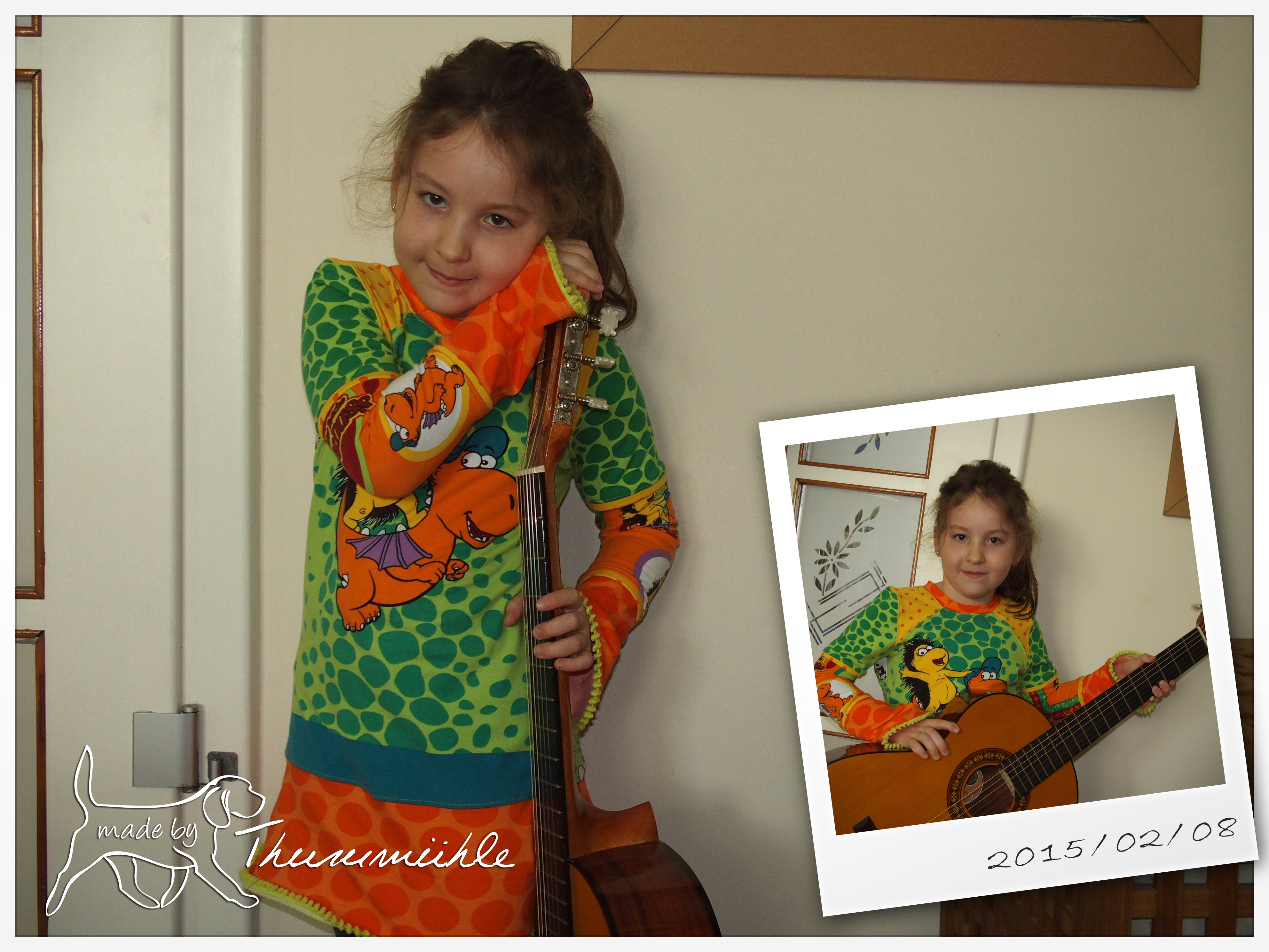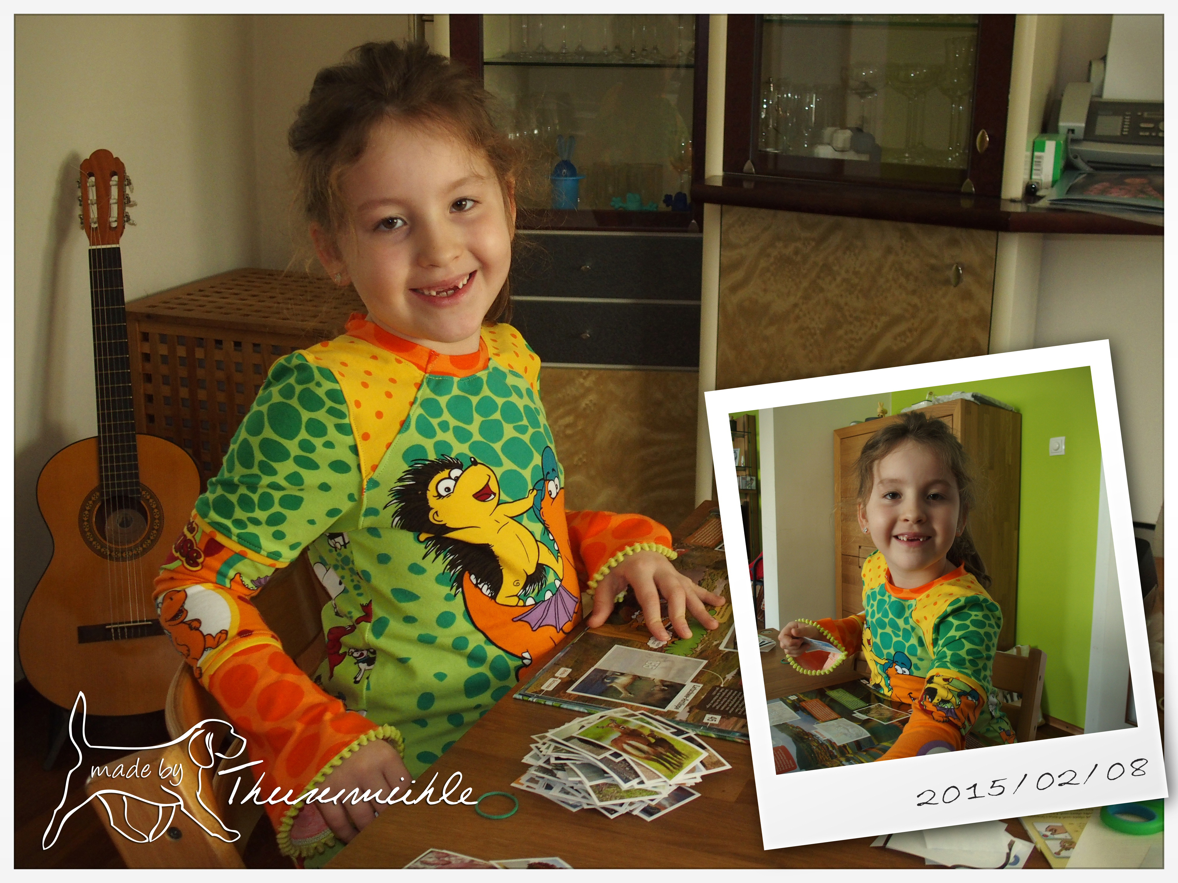 Ich habe mir Mühe gegeben, dem Shirt ein etwas mädchenhafteres zu geben, meine Wahl fiel auf eine verlängerte Antonia mit Bommerlborte. Versuch gelungen? Ach ja – wir haben endlich die beiden vorderen Hexenzähne verloren … 😀