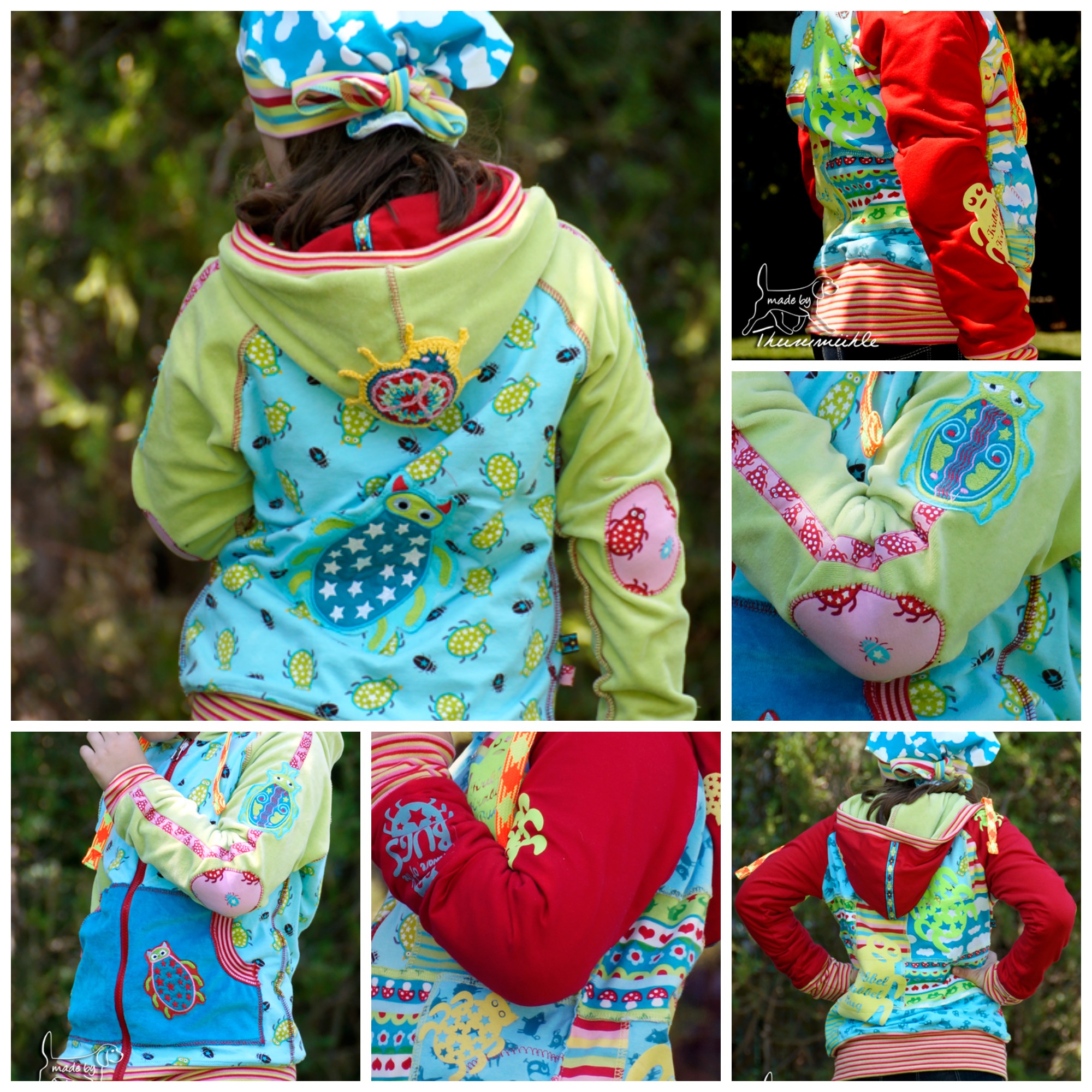 Seite 1: Ärmel Nicki, Body aus Farbenmix Käfer Jersey, Käferstickis aus der Serie Cheekybugs, passende Webbänder, auf der Kapuze prangt ein Häkelkäfer aus 1 Woche Häkelfrühling.