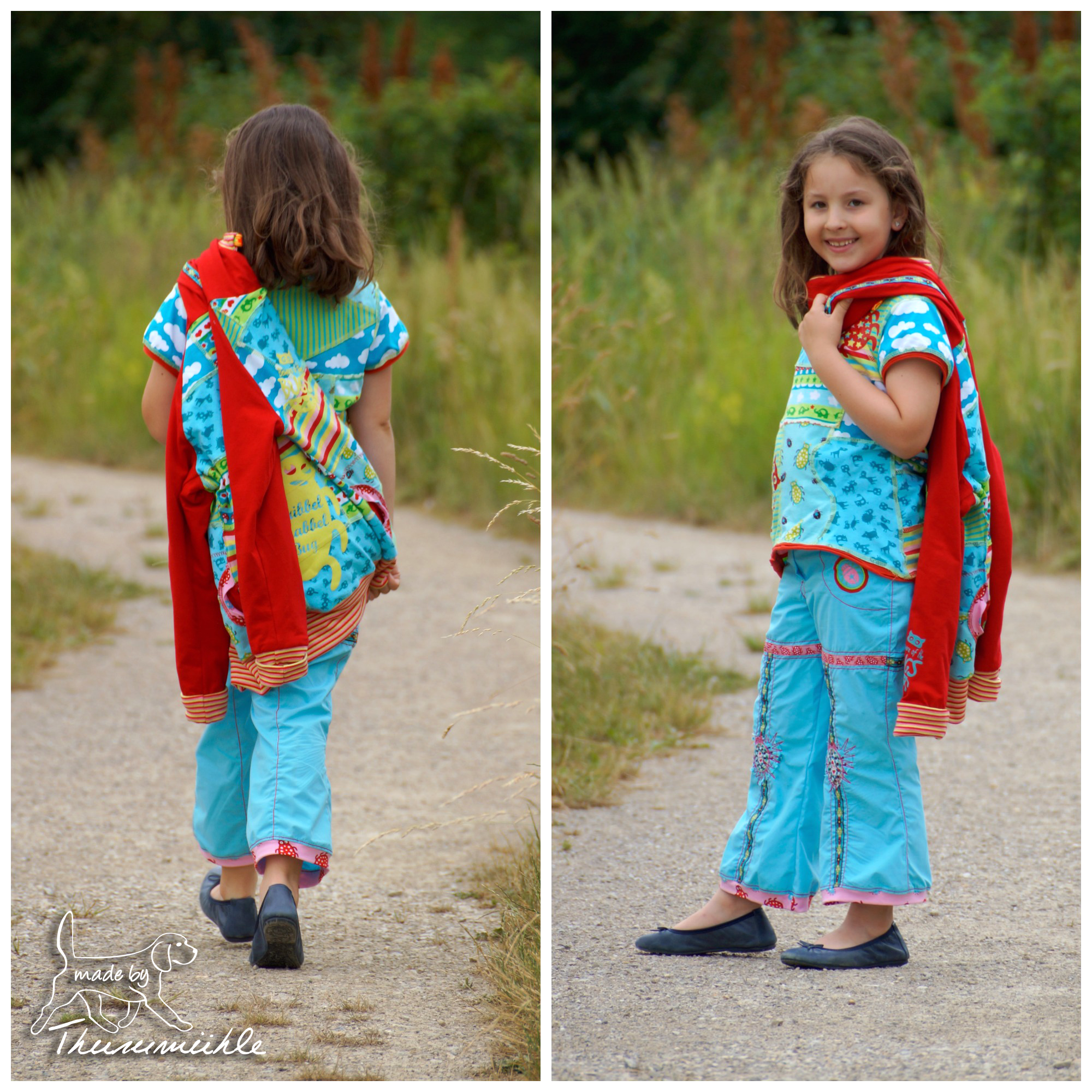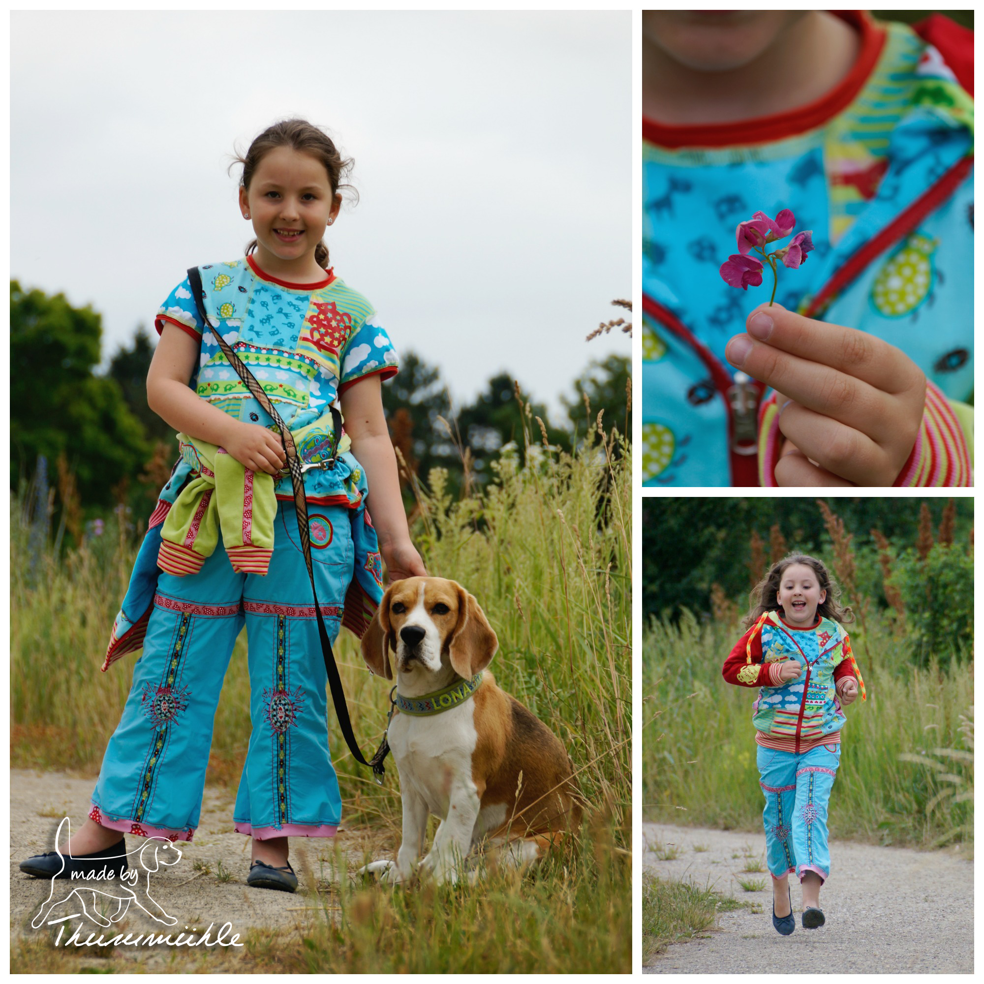 Schnittmuster Queenie in 134/140, Stoff Silikonpopeline türkis, Popeline „Beware of the Bugs“, Beinabschlüsse Jersey „Candybus“. Sticki „Vintage“ von Huups + gestickte Hosentaschen, passende Webbänder. Hose mit Reißverschluß und Knopflochgummi.