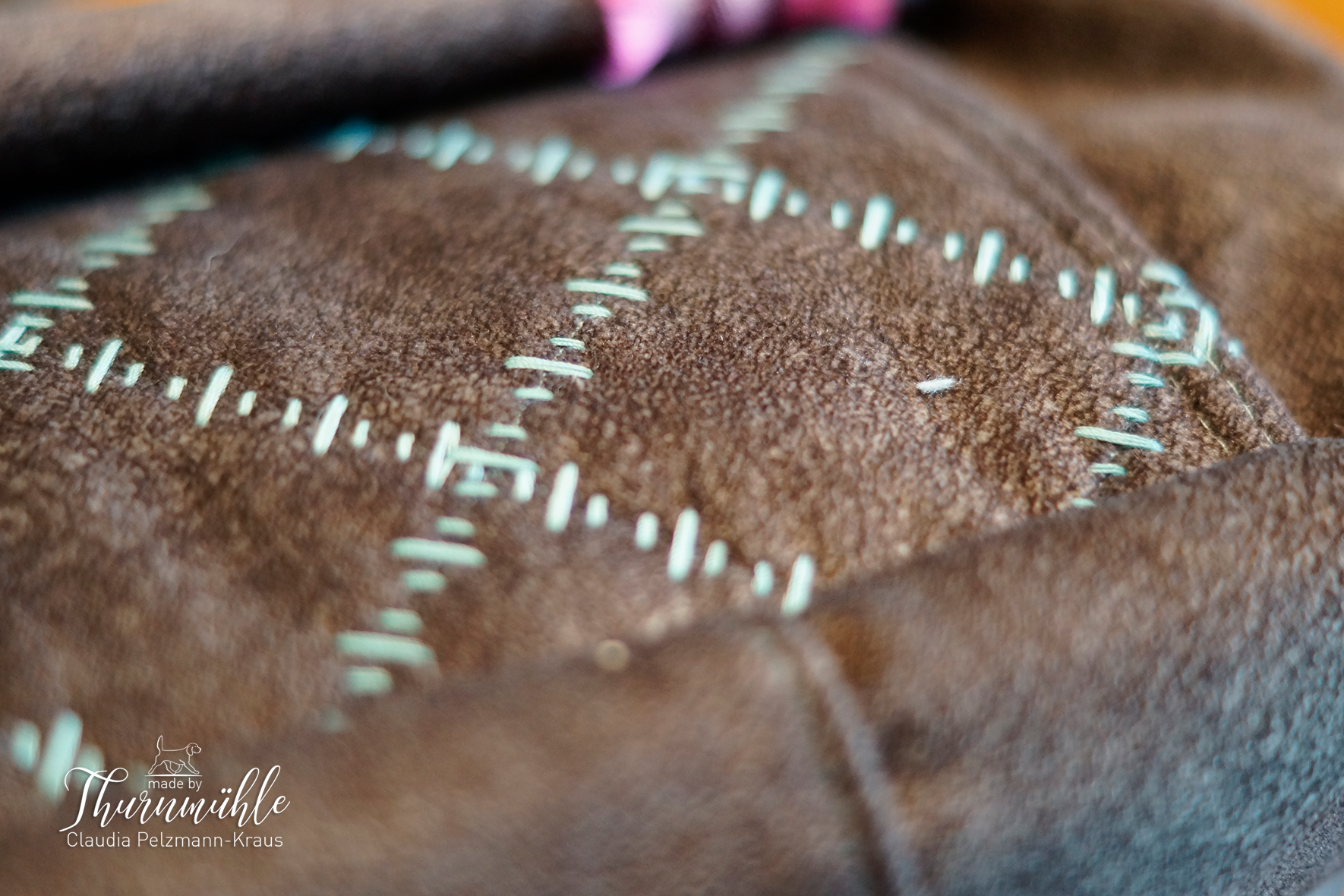 Daher habe ich sie eher schlicht gehalten. Genäht ist sie aus den Taschenvelour von Farbenmix, das Innenfutter ist eine gut abgelegenes Stoffschätzchen. Für den Taschenboden habe ich ein wenig mit den Zierstichen meiner neuen Bernina 590 experimentiert.