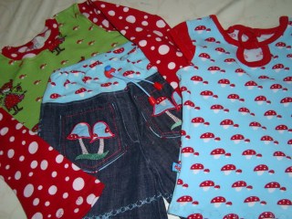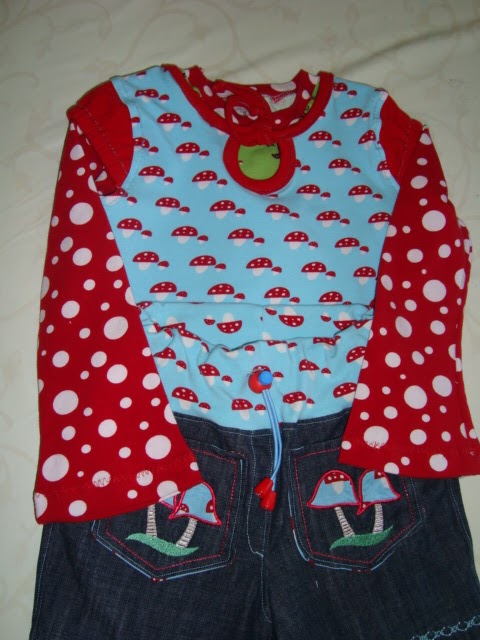 2. Stoff: Pilze auf hellblau von Janea´s World in Baumwolle und Jersey. Beine eingehalten mit Jerseybündchen, Bund ebenfalls Jersey mit Gummiband und Kordelstopper.