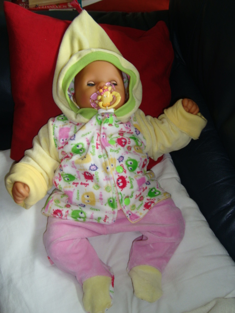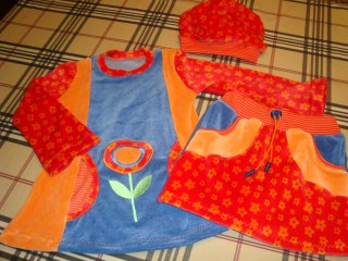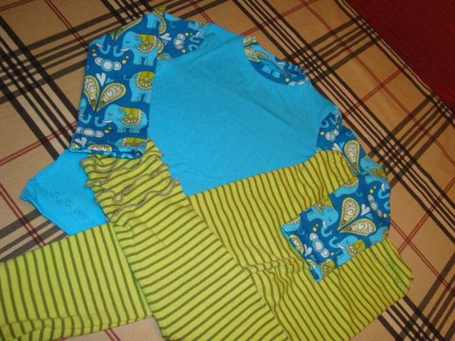 So – nun aber – Arwen in 110/116 ohne Nahtzugaben. Unterkleidchen aus Cheekybugs Jersey, Campan und Müller-Jersey. Oberkleidchen aus Silikon Popeline, Knöpfe Ebay-Fund, Stickdatei Cheekybugs von Huups, Farbenmix Webbänder.