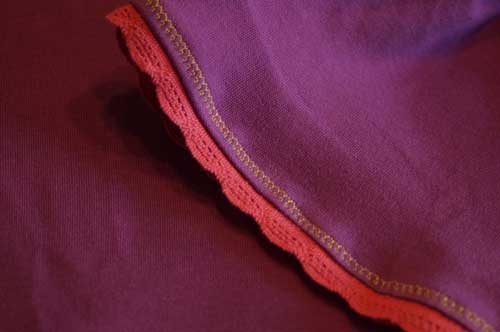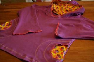Dieses mal habe ich mich ein wenig mit den Säumen gespielt und elastisches Gummiband dazwischen gefasst, sieht sehr nett aus. Meine Version ist mit Webware vorne unten und an den Ärmeln, passt ganz wunderbar!