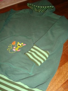Boah – das war aber nicht im Plan … aber was tut Mami nicht alles :-). Nur wo nähe ich das Ding jetzt drauf? Eventuell auf den 20 Jahre alten Retro-Jersey mit den Fischen, den ich unlängst in meinem Keller gefunden habe? Komisch, vor 20 Jahren habe ich noch nicht genäht, warum habe ich diesen Jersey gekauft??? Aber er ist echt süss! Bald mehr!